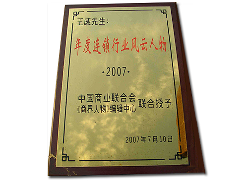2007年7月10日商業(yè)聯(lián)合會和《商界人物》編輯中心聯(lián)合授予鄭州市一品鮮食品機械制造廠總經(jīng)理王威先生“年度連鎖行業(yè)風(fēng)云人物:榮譽證書。