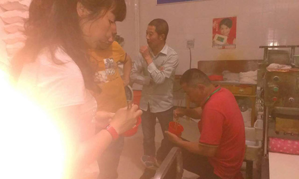 生產(chǎn)出來(lái)的面下鍋煮熟后,他們都在品嘗,真心的好啊