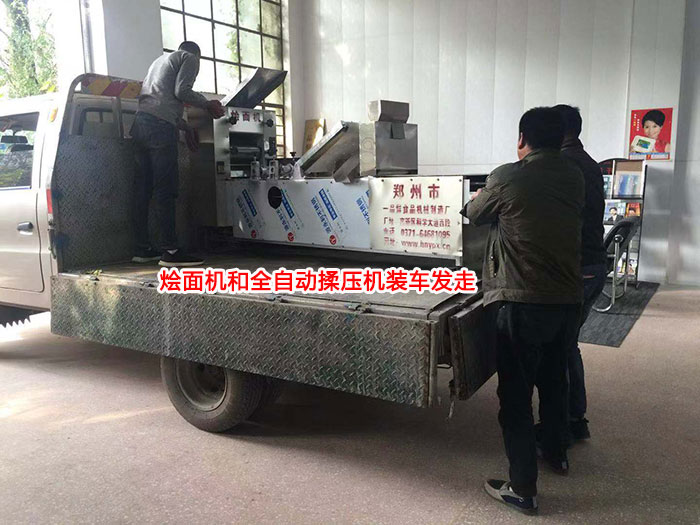 開(kāi)封杞縣客戶白先生定購(gòu)一品鮮全自動(dòng)揉壓機(jī)和雙輥雙刀燴面機(jī)。在廠進(jìn)行兩天的學(xué)習(xí)后,進(jìn)行設(shè)備調(diào)試,裝車(chē)發(fā)貨!