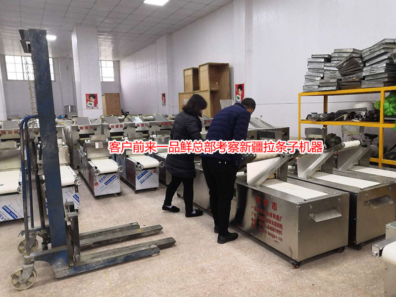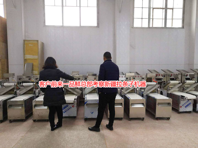 漯河客戶在新疆承包土地種棉花,閑時(shí)在當(dāng)?shù)剞r(nóng)貿(mào)市場(chǎng)轉(zhuǎn)轉(zhuǎn),發(fā)現(xiàn)當(dāng)?shù)氐男陆瓧l子都是手工做,沒有人專門做好去批發(fā)?蛻舭l(fā)現(xiàn)這個(gè)商機(jī)后,就在網(wǎng)上查詢能生產(chǎn)拉條子 的機(jī)器。在了解到一品鮮多功能設(shè)備可以生產(chǎn)拉條子,扯面,拉面等多種面食后,前來總部進(jìn)行現(xiàn)場(chǎng)考察。